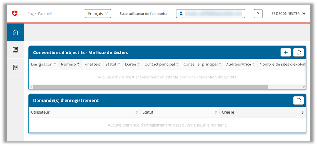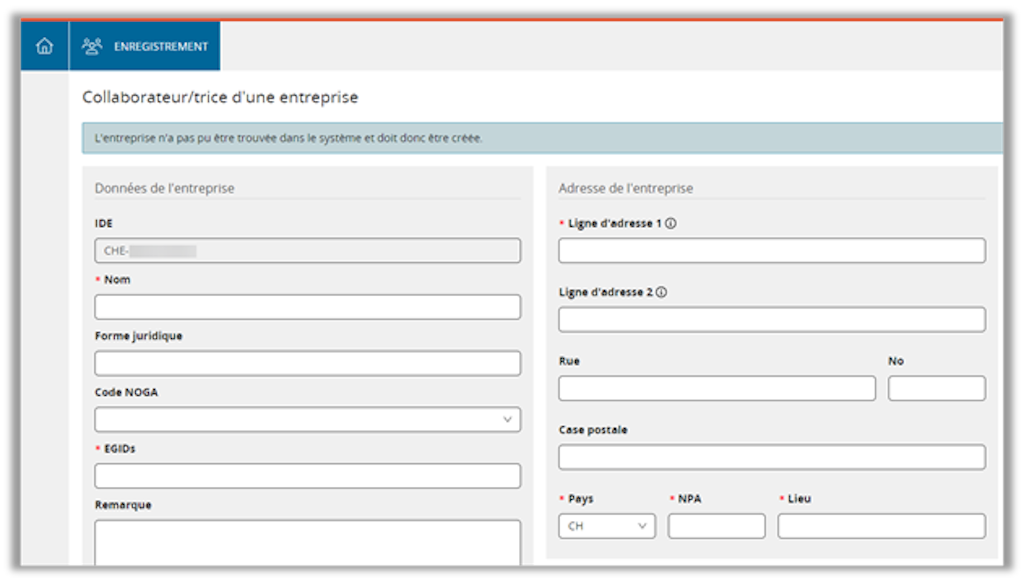 Si votre entreprise est déjà enregistrée avec cet IDE dans l’outil COS parce qu’une autre collaboratrice ou un autre collaborateur a déjà effectué cette procédure, vous accédez directement à la page d’accueil (étape 2).