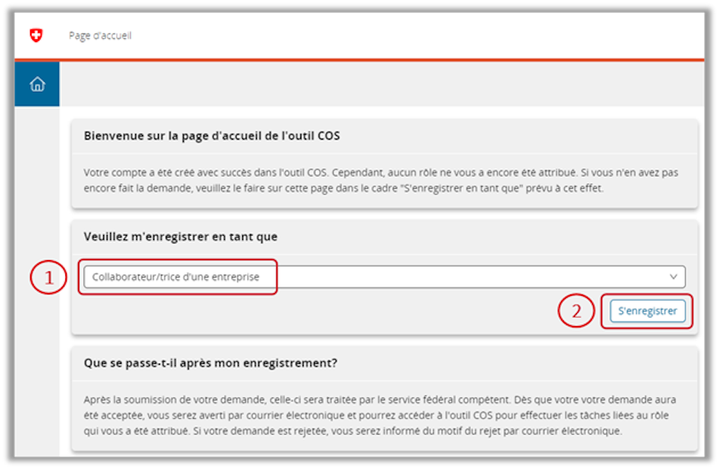 - Lors de la première connexion à l’outil COS, sélectionnez le rôle