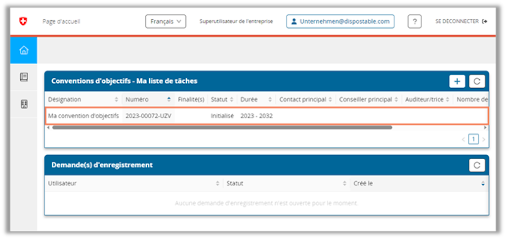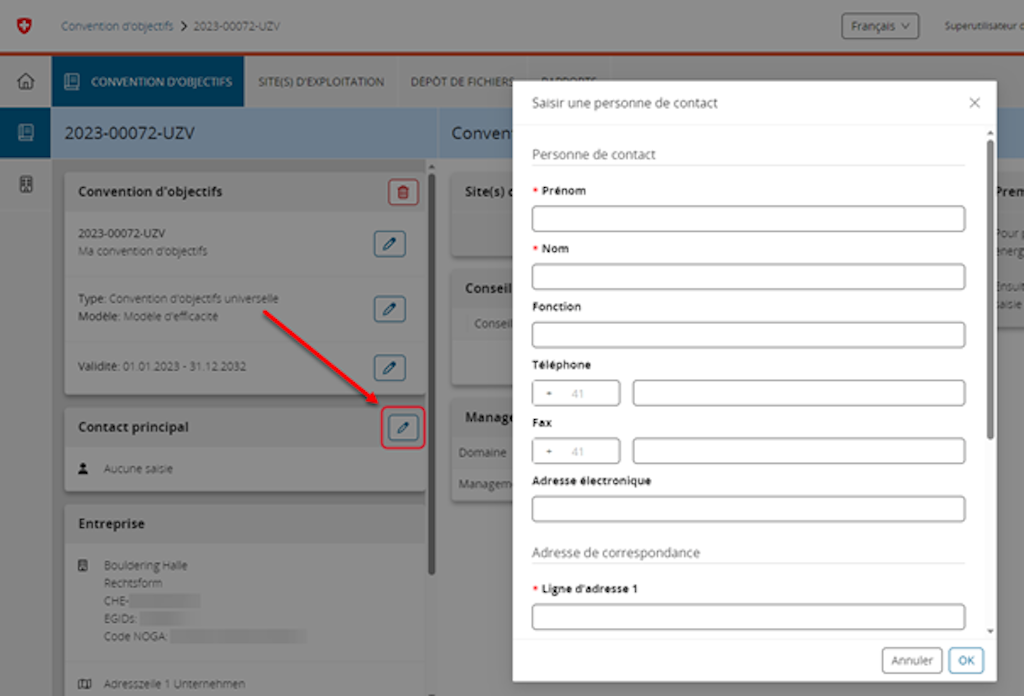 Si le contact principal pour la présente convention d’objectifs est une tierce personne (ni le superutilisateur, ni la collaboratrice ou le collaborateur enregistré ou attribué à l’entreprise), les indications le concernant revêtent un caractère informel. Cette tierce personne ne participe alors pas activement à la convention d’objectifs et, à ce titre, elle n’assume aucun droit ni obligation.